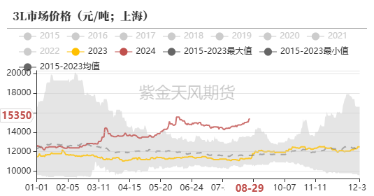 截至8月29日,越南3L价格为15350元/吨,环比上周上涨350元/吨。