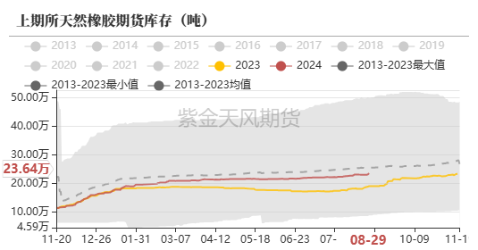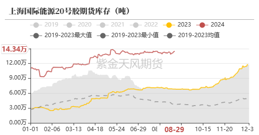 截至8月29日,上期所天胶期货库存环比增加,20号胶期货库存环比增加。