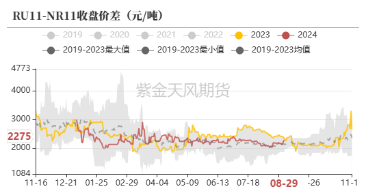 RU-NR价差:中性偏多截至8月29日,RU11-NR11价差为2275元/吨,环比上周上涨。胶水系产出不畅,下游悲观的背景下,预计价差持续反弹。