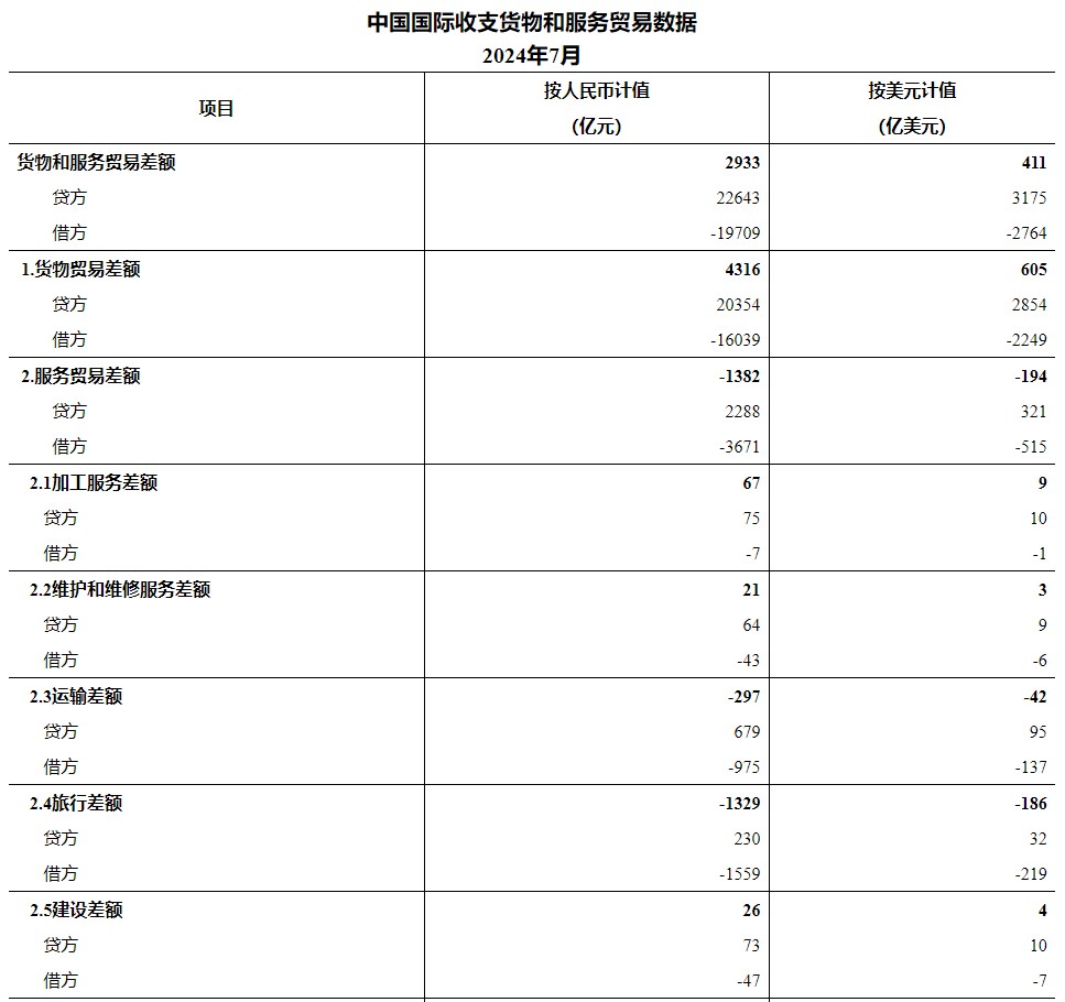 按美元计值,2024年7月,我国国际收支货物和服务贸易出口3175亿美元,进口2764亿美元,顺差411亿美元。