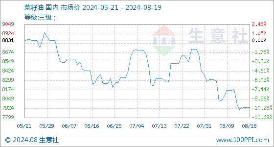 8月19日生意社菜籽油基准价为7933.33元/吨
