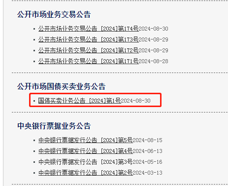 央行官网上线“公开市场国债买卖业务公告”专栏后,8月30日即出现了第一次更新。