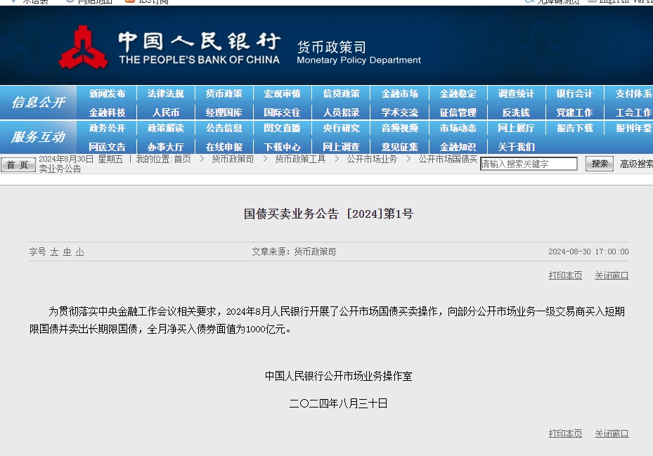 30日盘后,央行网站发布消息称2024年8月人民银行开展了公开市场国债买卖操作,向部分公开市场业务一级交易商买入短期限国债并卖出长期限国债,全月净买入债券面值为1000亿元。