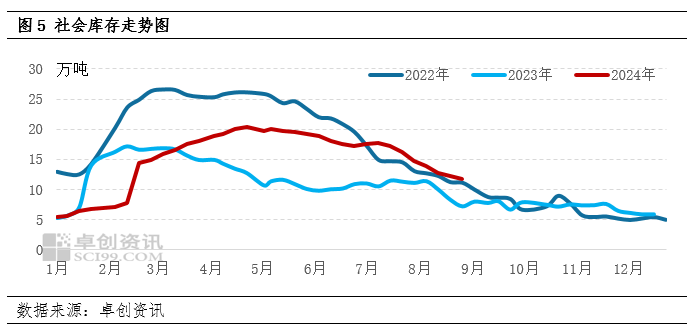 而且,尽管原料年内持续紧张,但对于现货市场的供应实际影响缺有限,根据卓创资讯监测现货市场库存情况来看,2024年社会库存基本维持宽松状态,到8月份,库存总量也在近三年同期的高位上。因此原料的短缺,对于现货市场的影响有限,之所以影响有限,多与需求不佳有关。