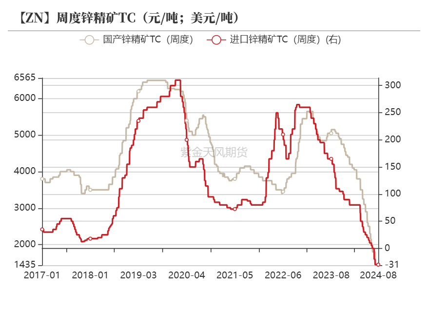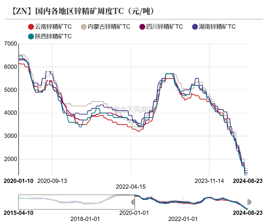 国产锌精矿周度TC报1490元/金属吨。锌精矿加工费区域性小幅调整,多数持稳运行。目前国产锌矿供不应求,贸易商手中货源较少,炼厂需求量较大,导致锌精矿加工费多以低价运行,高位价格目前仍为集团内部价格以及内蒙古地区成交价。