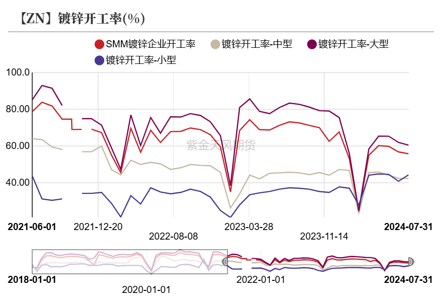 从当前精锌实际生产情况来看,原料紧缺限制炼厂开工,近期新增内蒙古及云南地区炼厂检修减产,预估国内精锌炼厂开工下滑至71.53%,环比下滑0.71%。