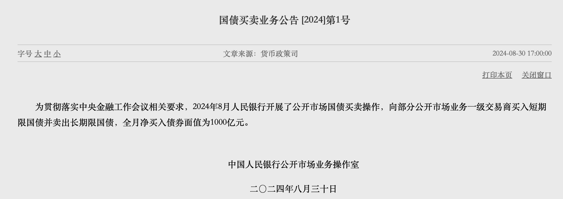 公告显示,为贯彻落实中央金融工作会议相关要求,“2024年8月份人民银行开展了公开市场国债买卖操作,向部分公开市场业务一级交易商买入短期限国债并卖出长期限国债,全月净买入债券面值为1000亿元”。