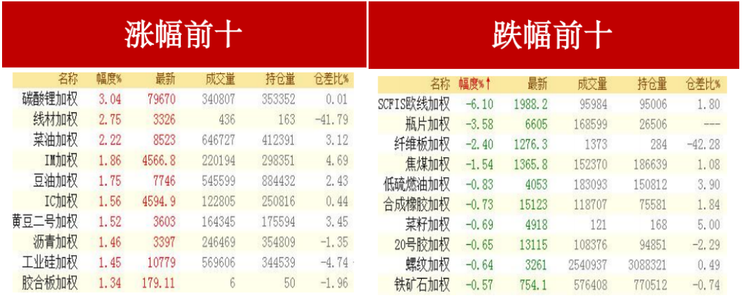 临近月末,下游材料厂及电芯厂已处于旺季准备状态,供大于求背景下,下游客户询单有所改善,碳酸锂涨逾 3%,纤维板跌停。贵金属全线下跌,沪金下跌,沪银微跌。