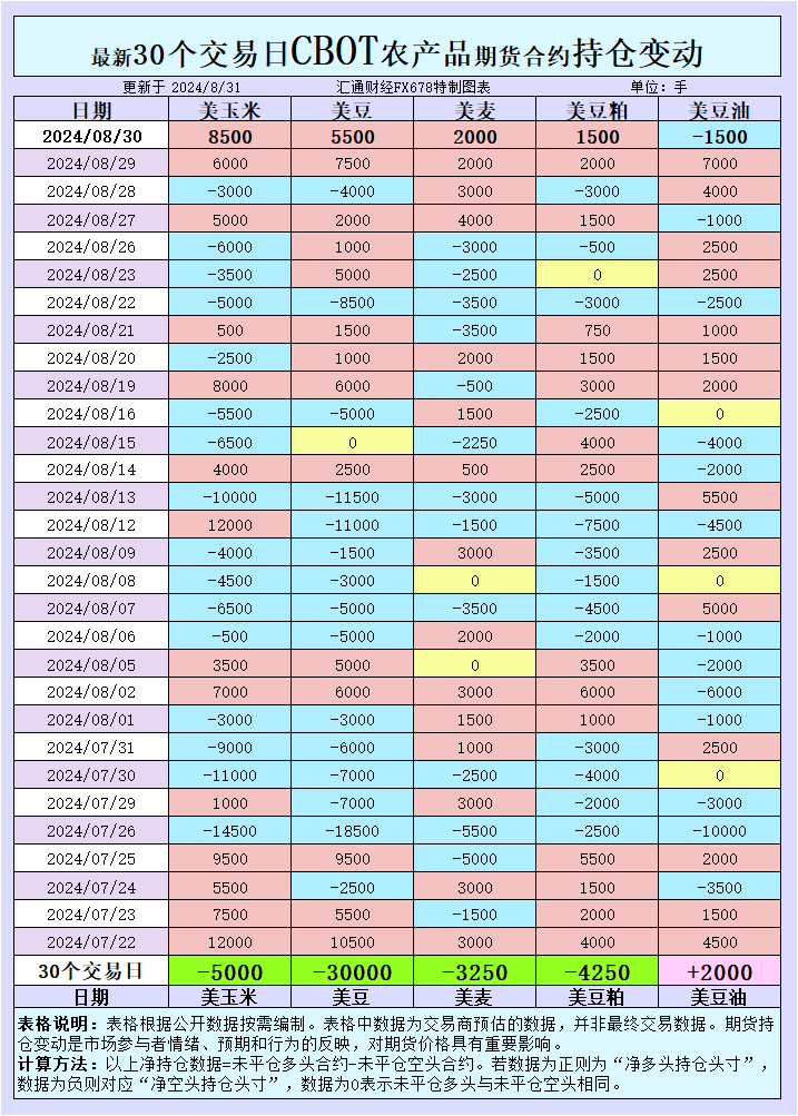 增加CBOT玉米投机性净多头;增加CBOT大豆投机性净多头;增加CBOT小麦投机性净多头;增加CBOT豆粕投机性净多头;增加CBOT豆油投机性净空头。