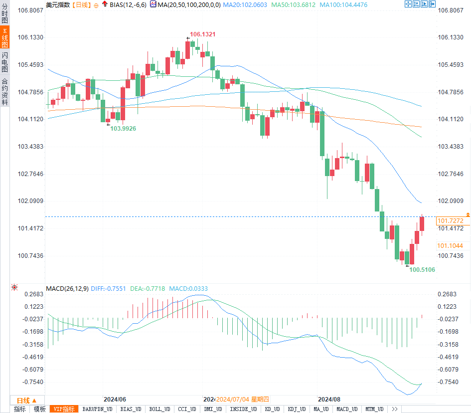 分析师Peter Cardillo表示:“我们确实会看到降息,但是否为25个基点或50个基点,将取决于下周的就业数据。”市场的普遍预期是,美联储将于年底前进行进一步的降息调整。美元指数在通胀数据公布后上涨至10日高点,盘尾上涨0.3%,报101.7,但8月美元指数整体下跌2.6%,创下去年11月以来的最差月度表现。