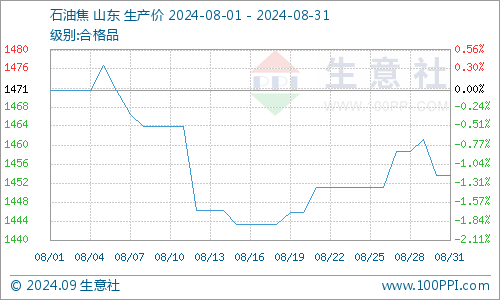 据生意社商品分析系统显示,8月份地炼石油焦行情整体下行,国内主要地炼厂家石油焦产品主流均价8月31日为1454.00元/吨,8月1日为1471.75元/吨,月跌幅为1.21%。