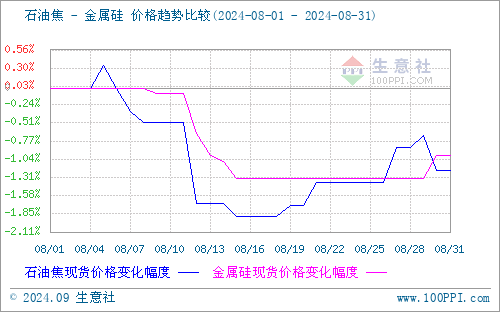 需求端:8月受前期行情持续下行影响,虽有少部分金属硅工厂停工,但场内整体开工率仍处高位,因此,金属硅整体供应依旧宽松,供应端整体压力较大,市场去库表现一般,供应方面给予金属硅的支撑薄弱。目前金属硅对石油焦采购需求一般,对石油焦市场支撑一般。