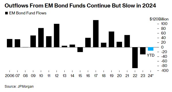 摩根大通的数据显示,在美国利率可能在更长时间内维持高位的背景下,新兴市场债券基金一直难以吸引资金流入,今年只有九周实现净流入。尽管与2023年的310亿美元流出和2022年的900亿美元流出相比,150亿美元的资金流出有所改善,但这种情况突显了基金经理面临的挑战。