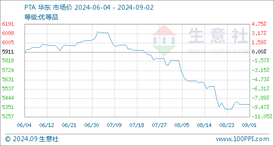 9月2日,生意社PTA基准价为5383.00元/吨,与本月初持平。