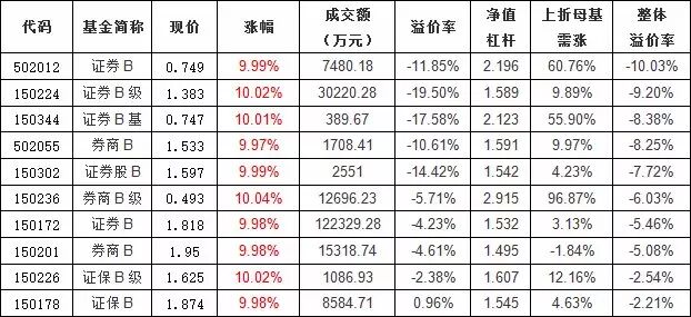 如下表,有8只分级基金整体折价率超过5%,折价最高的证券B(502012)所在分级基金折价率达10%,意味着即使下周一券商板块不上涨,该基金至少还有一个涨停板,有两个涨停板也是有可能的,其他证券B大概率在下周一封于涨停,根本原因是这些基金单日净值涨幅远超10%,但价格却受到涨跌停板限制,造成被动折价,因而催生了补涨需求。