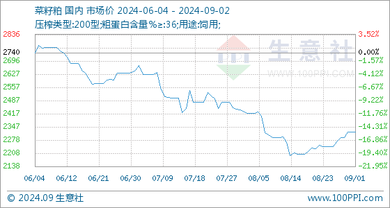 9月2日,生意社菜籽粕基准价为2320.00元/吨,与本月初持平。