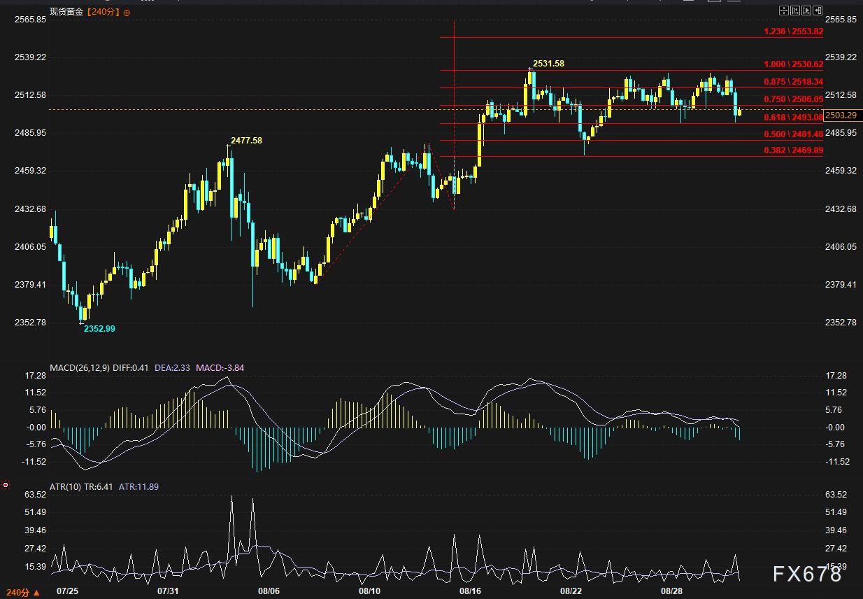 虽然,现货黄金8月29日(上周五)收阴结束并稍稍收于日图粉红线下方,但价格在最低点与8月27日低点形成双底形态,且周末前出现反弹迹象,表明接下来节奏轮到多头上演主场。我们可以从4小时图级别更精细地观察到这一现象:金价不仅在2493附近形成双底,而且还出现了阳孕线。接下来,金价守稳2504一线的情况下,多头接下来目标将依次是2512-2515区间,然后是2526-2528区间,然后是2531。