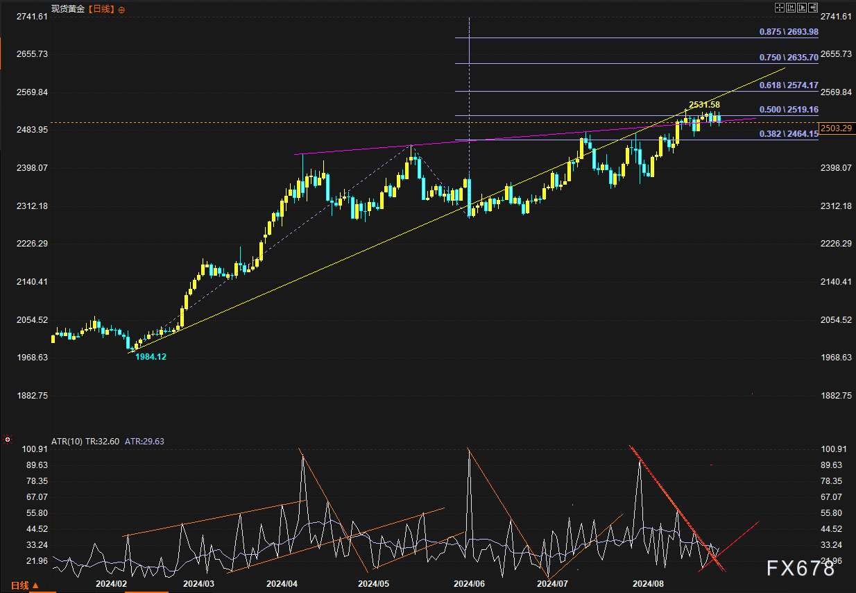 日图看,现货黄金持续围绕如图粉红线阻力变支撑的斜线运行,自金价创历史新高2531.58美元/盎司以来,多空已第四次完成了对该线的争夺。从次数来看,应该要迎来破局见分晓的时候了。同时,ATR已显露出低位拐头并形成朝上运行的苗头(见下副图ATR的红色斜线),ATR的上行意味着金价的真实波动将要加大。