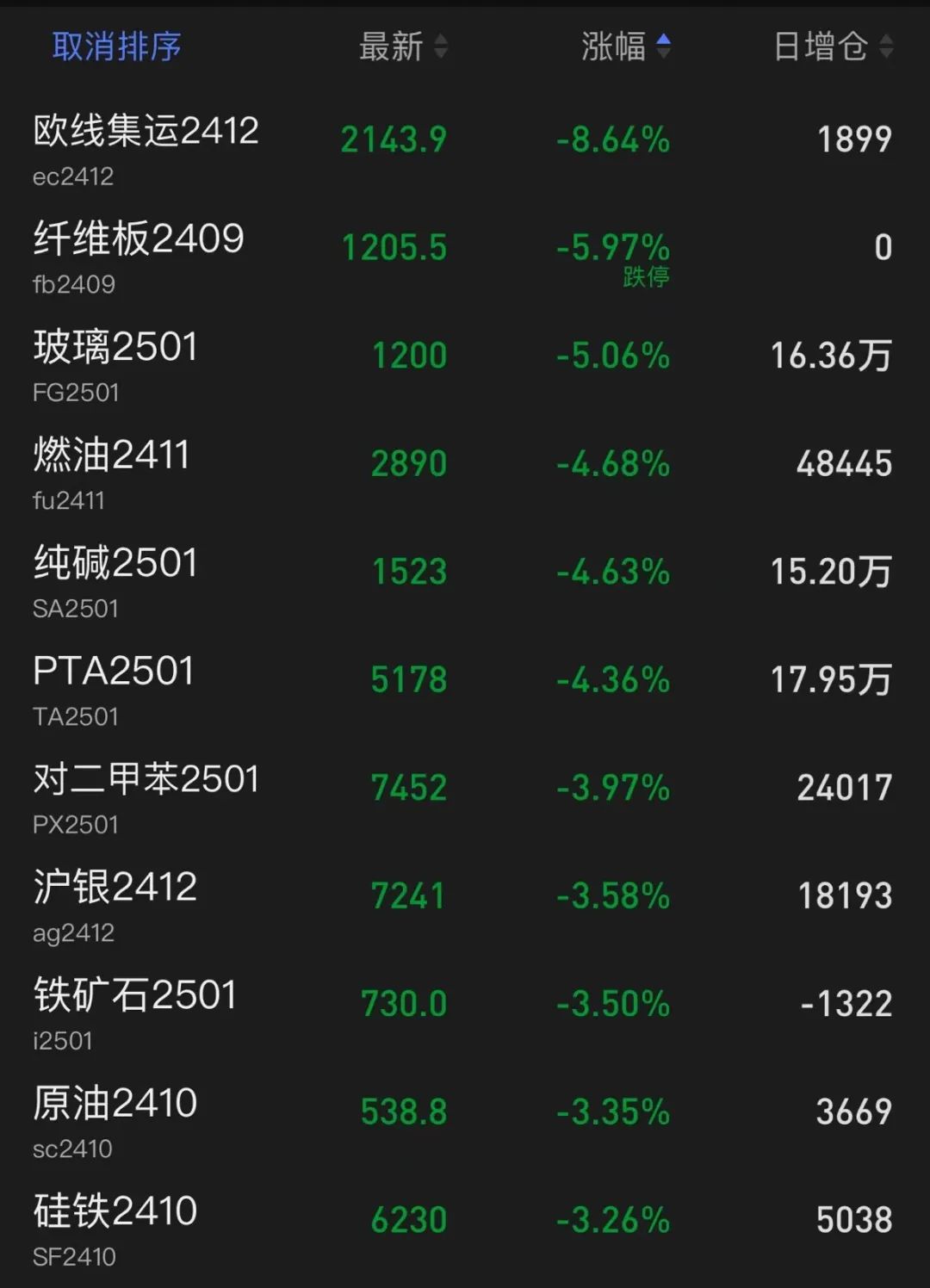 大宗商品期货集体下挫,玻璃大跌5%,价格创近4年新低;欧线集运大跌超8%,纯碱、燃油、PTA大跌超4%,铁矿石、硅铁、原油、沪银跌超3%。