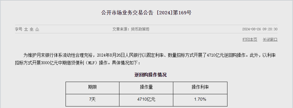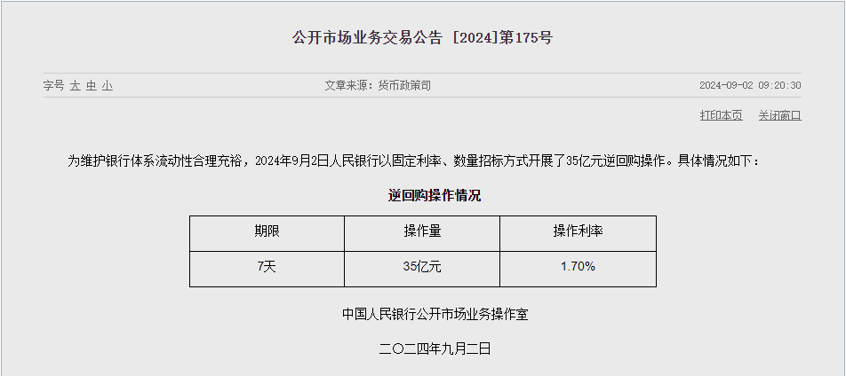 人民银行9月2日公告称,为维护银行体系流动性合理充裕,2024年9月2日人民银行以固定利率、数量招标方式开展了35亿元逆回购操作,中标利率为1.7%。因今日有4710亿元7天期逆回购到期,当日实现净回笼4675亿元。