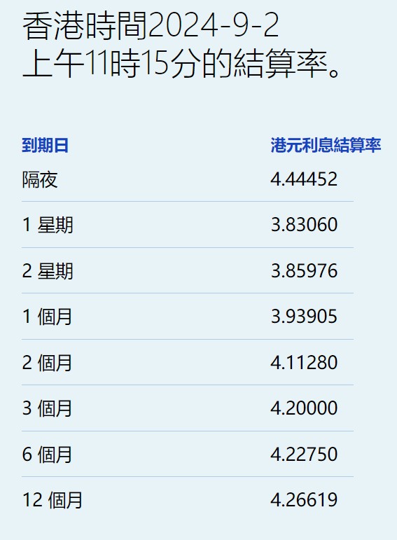 港元拆息在9月首个交易日个别发展,其中,隔夜息大涨报4.44452%,创一个月新高,而与楼按相关的一个月拆息亦连升三天,报3.93905%,续见8月26日以来最高。