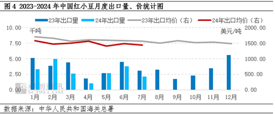 从出口来看,海关数据显示,2024年7月份中国红小豆出口量2.14千吨,环比降幅43.23%,出口需求下降。但8月22日韩国红小豆招标价格不低,其中大粒成交价格1512美元/吨,折合当日人民币价格5.40元/斤;小粒成交价格1428美元/吨,折合当日人民币价格5.10元/斤,一定程度支撑市场心态。