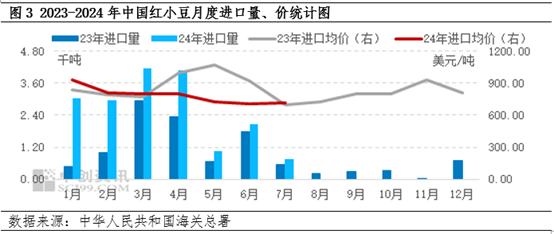 从进口来看,近日山东青岛港地区部分小颗粒赤小豆毛粮自提价格5950-6000元/吨,成品自提价格6500元/吨,按质定价,相较国产红小豆仍具有价格优势。但据中华人民共和国海关数据显示,7月份我国红小豆进口量仅0.76千吨,对国内市场影响有所减弱。