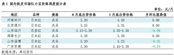 以黑龙江哈尔滨尚志地区瑞丰一号/日本红小豆为例,7月份贸易商毛粮短期库存成本多在4.60-4.70元/斤,8月份虽然部分毛粮采购价格下跌,但由于贸易商多数消化库存,红小豆毛粮采购成本对价格影响程度不大。8月份红小豆价格主要受到毛粮库存成本支撑,下调空间有限。