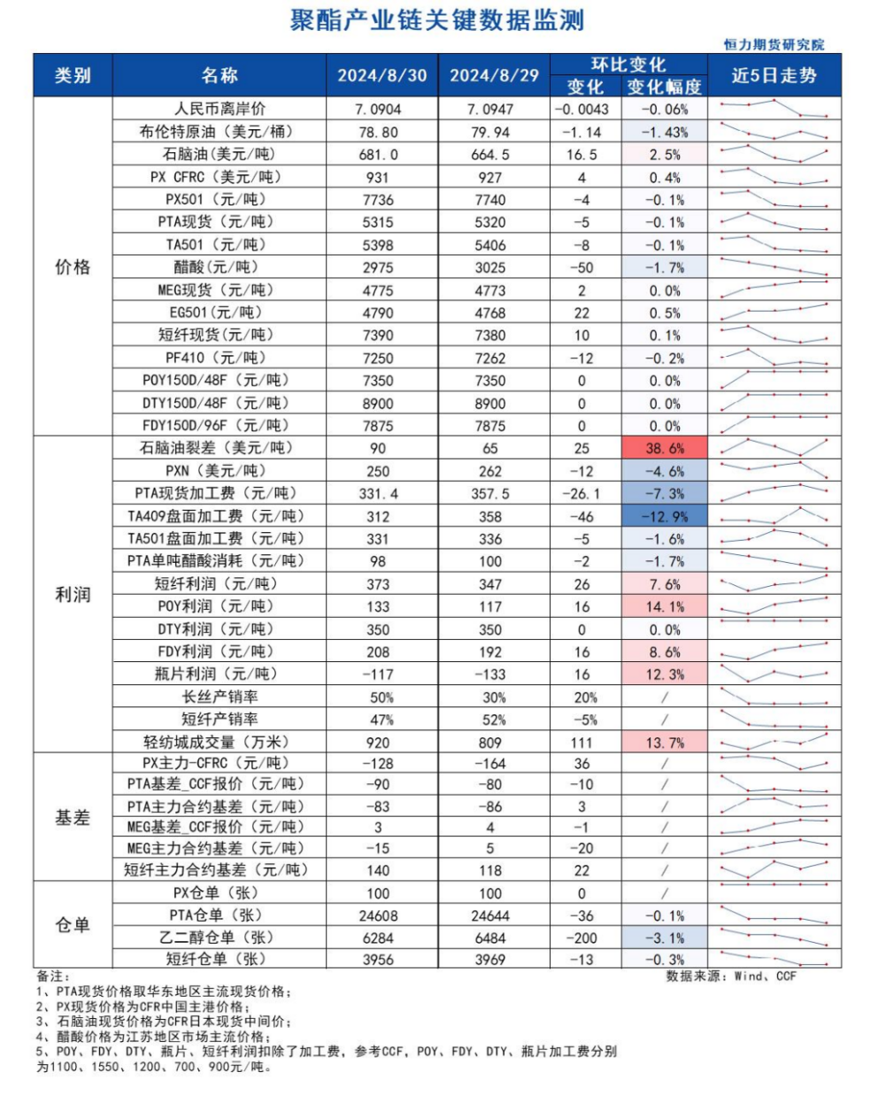 今日01合约以5398点收盘,较昨日结算价上升6点,涨幅0.11%,日内增仓21556手至123.92手,TA9-1价差为-150(-12)。现货方面,今日主流现货基差在01-90,下周主港在01-90~95附近商谈;PTA现货加工费在331元/吨附近(环比-7.3%);供给方面,PTA负荷下降0.4%至82.2%,恒力石化PTA-5生产线于8月17日开始停车检修,涉及产能250万吨,220万吨生产线计划9月进行检修;四川能投100万吨PTA装置8月24日重启,此前于4月3日停车;台化兴业120万吨PTA装置计划9月起停车检修两周;东营威联250万吨PTA装置8月29日附近小幅降负。下游聚酯负荷为88.1%(+1.4pct);加弹、织造及印染的开机率维持增长,分别达到90%、75%和79%。江浙涤丝今日产销整体偏弱,至下午3点半附近平均产销估算在5成附近,今日轻纺城市场总销量920万米,较昨日增加111万米。