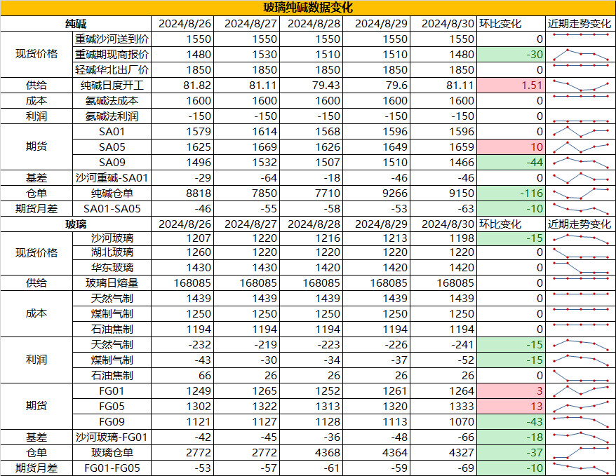 当前碱厂送到价格在1550元/吨左右,期现价格在1480元/吨,当下开工差不多是目前碱厂的供需平衡点,下周由于部分企业检修推迟,开工仍会维持75-80%的低位,短期纯碱仍处于相对平衡状态,但下游本周已完成小幅补库,9月中旬后产量回升预期强,后续大概率无法继续维持平衡。