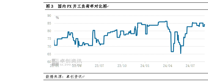 8月国内PX供应量小幅下降,开工负荷亦下滑,PX开工负荷在80.13%,较上月下滑1.89个百分点。8月份PX开工负荷稳中小降,主要原因是金陵石化60万吨PX装置月初降负至7成运行;盛虹石化400万吨PX装置下旬降负至9成运行;恒力石化520万吨PX装置下旬短暂降负一周时间至9成。