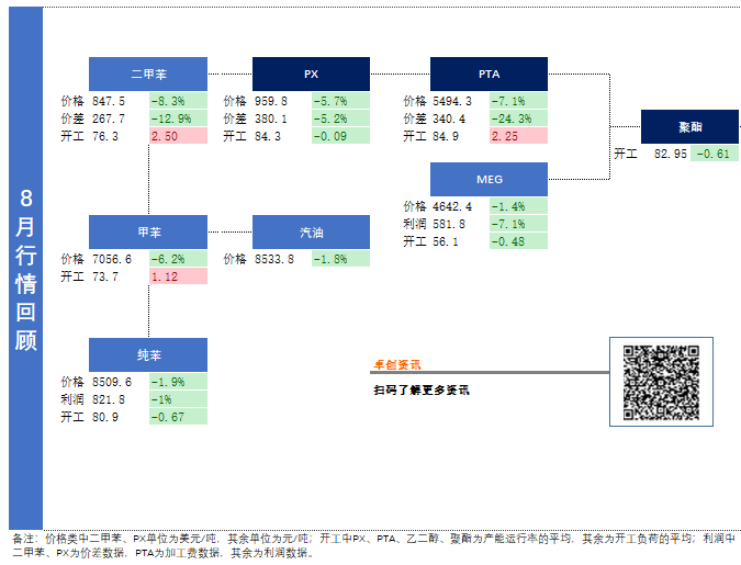 亚洲PX市场破位下行。8月CFR中国PX均价为959.8美元/吨,较上月均价下跌5.67%,FOB韩国均价为939.8美元/吨,较上月均价下跌5.78%。本月内因经济衰退担忧引发资金避险情绪发酵,以及中东紧张局势降温影响,国际油价承压重挫,进而PX成本端支撑塌陷。同时国内PX装置开工负荷延续处于历史高位,且中东及印度地区增加对国内供应量,而需求端PTA装置存在计划内及计划外停车事件发生,激化供需基本面矛盾,场内利空氛围占据主导。因此本月内PX商谈单边下行,不断刷新年内低值,一路回探至近20个月内低位。直至月末受成本油市反弹带动,PX价格重心方才企稳回暖。