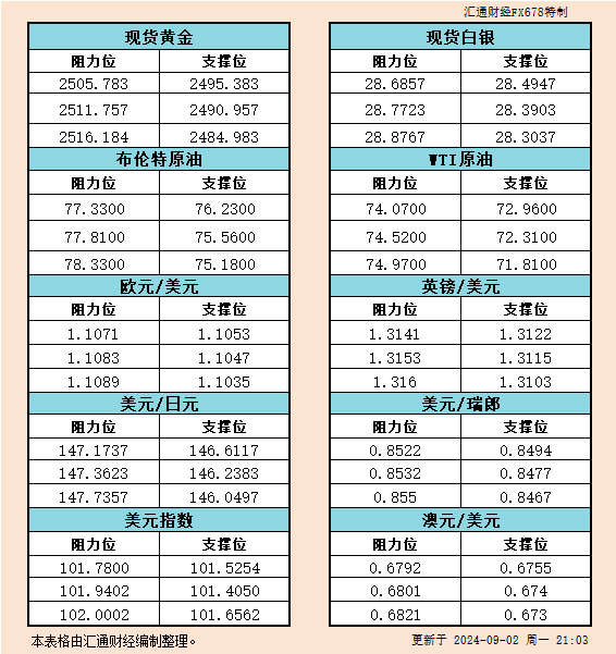 汇通财经APP讯——9月2日美市黄金、白银、原油、美元指数、欧元、英镑、日元、瑞郎、澳元支撑阻力位一览。