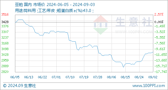 9月3日生意社豆粕基准价为3064.00元/吨