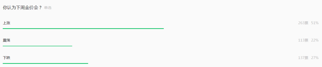 8月26日当周伦敦金价格开盘2512.07美元/盎司,最高2529.06美元/盎司,最低2493.5美元/盎司,收盘2503.34美元/盎司。北京黄金经济发展研究中心调查显示,市场人士认为本周国际金价震荡可能性较大。投票显示,有51%的读者看涨本周金价、22%看震荡、27%看空。