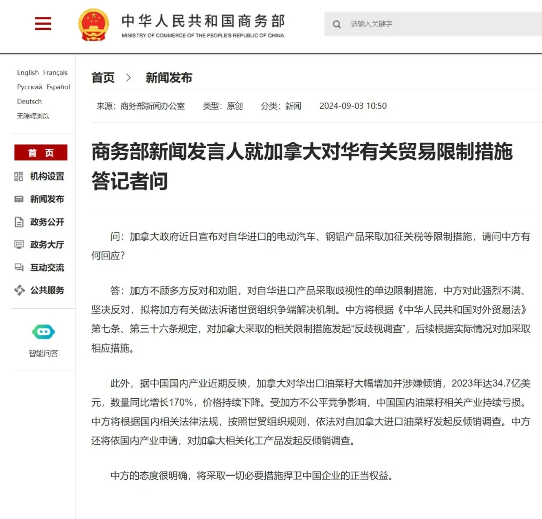 问:加拿大政府近日宣布对自华进口的电动汽车、钢铝产品采取加征关税等限制措施,请问中方有何回应?