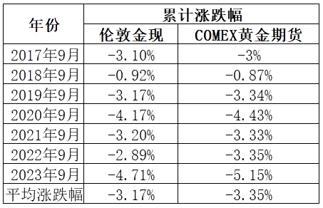 数据显示,从2017年开始,每年9月国际黄金价格均会出现下跌,至今已持续7年,这也被称为黄金市场的“九月魔咒”。