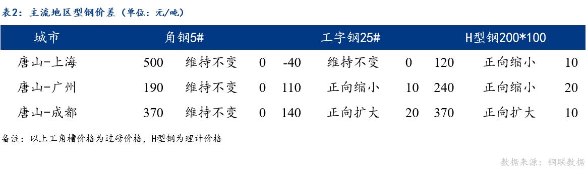 从区域价差来看,今日唐山角钢与上海、广州、成都的角钢价差维持不变;唐山工字钢与上海工字钢价差维持不变,与广州工字钢价差正向缩小,与成都工字钢价差正向扩大;唐山H型钢与上海、广州H型钢价差正向缩小,与成都H型钢价差正向扩大。