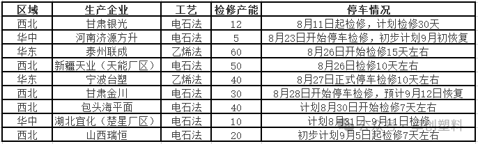 9月份计划检修的企业有所减少,8月份开始检修且计划延续到9月份的有7家,涉及产能237万吨,9月新的检修计划有2家,共涉及企业产能30万吨,除此之外还有8家长期停车企业,涉及产能157万吨。从目前计划检修企业来看,预计9月份检修损失量在20万吨,从规律来看,9月份还将有部分临时新增检修企业存在,整体预计9月份检修损失量在25万吨左右,少于8月份的32.8万吨的检修损失量,所以预计9月份PVC开工负荷率略提升。