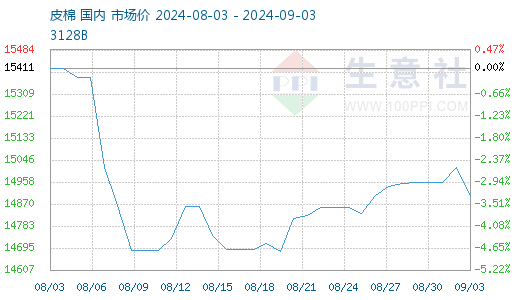上周受宏观信息提振,国内棉花现货价格小幅上行,之后在郑棉下跌后,现货行情掉头向下,据生意社商品行情分析系统,9月3日3128B级皮棉现货价格在14902元/吨,环比下跌3.31%。