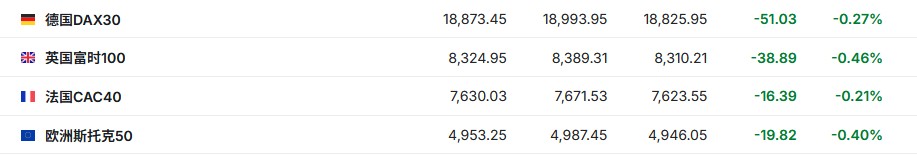 2.截至发稿,德国DAX指数跌0.27%,英国富时100指数跌0.46%,法国CAC40指数跌0.21%,欧洲斯托克50指数跌0.40%。
