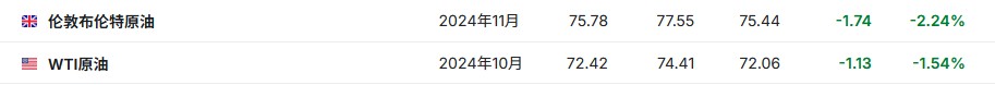 3.截至发稿,WTI原油跌1.54%,报72.42美元/桶。布伦特原油跌2.24%,报75.78美元/桶。