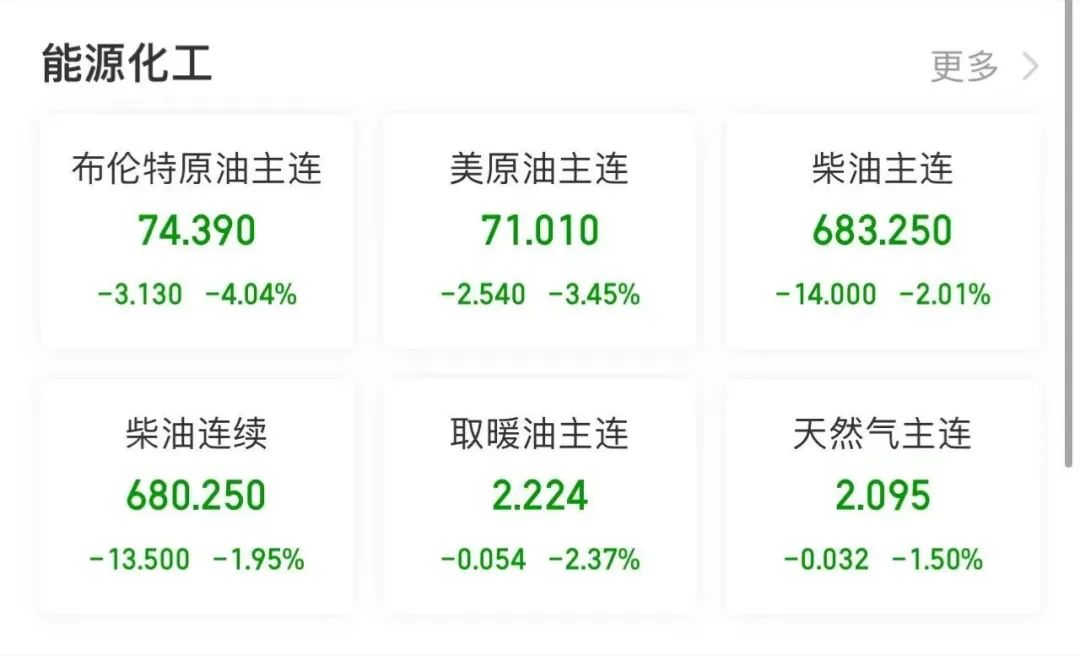 受此影响,WTI原油一度大跌3.45%,布伦特原油跌超4%,回落至74美元/桶下方,创去年12月中旬以来新低。SC原油、燃料油主力合约跌超3%。