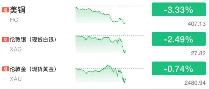 此外,黄金、白银价格跳水,COMEX铜期货跌超3%。