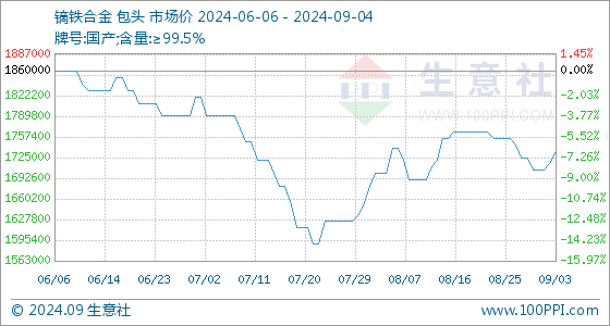 9月4日,生意社镝铁合金基准价为1735000.00元/吨,与本月初(1705000.00元/吨)相比,上涨了1.76%。
