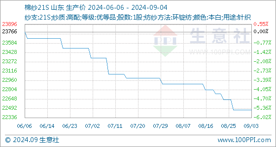 9月4日,生意社棉纱21S基准价为22466.67元/吨,与本月初持平。