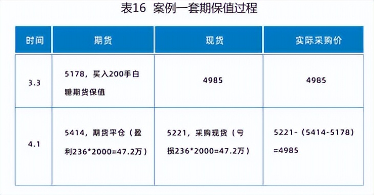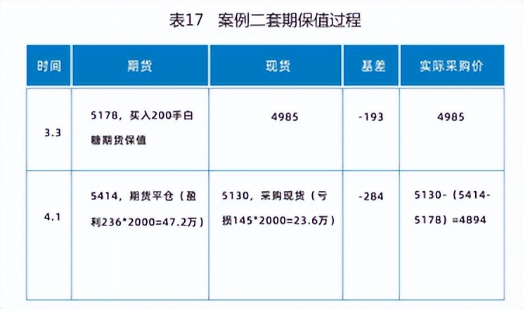 2021年3月初,某食品厂为4月份生产备货,需要采购原料2000吨白糖,此时白糖的现货价格4985元/吨、期货SR2109价格是5178元/吨。因考虑未来价格上涨,该企业在期货上买入200手SR2109白糖期货。等到4月初,将期货头寸平掉,并买入了现货。此时期货价格是5414元/吨,现货价格是5138元/吨。由于期货上涨幅度大于现货上涨幅度,即基差走弱,因此4月份的最终白糖采购价还低于3月初未涨价前的现货价格,即套保带来了额外的基差收益。