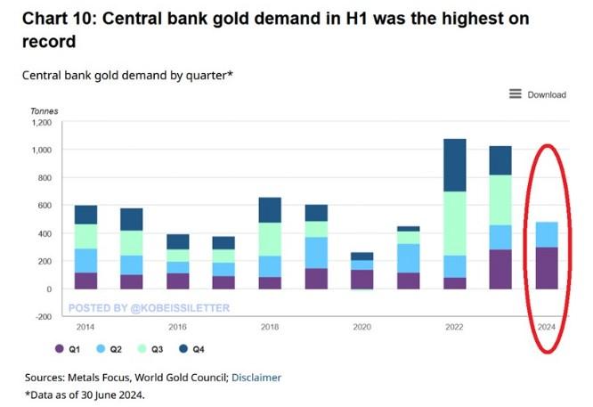Kobeissi Letter指出:“2024年上半年,各国央行的全球黄金净购买量达到483吨,是有记录以来的最高水平。”“这比2023年上半年创下的460吨纪录高出5%。”