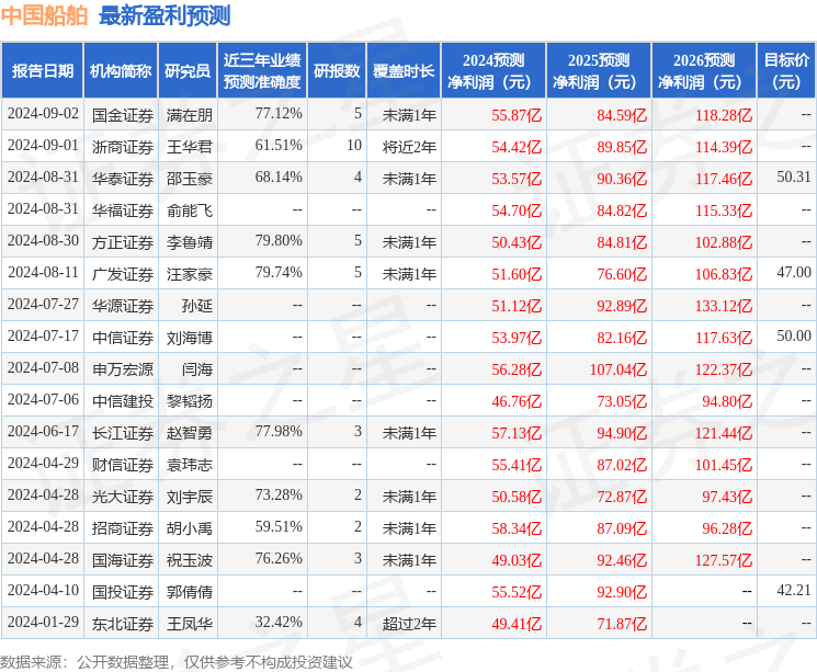 盈利预测与投资观点:中国船舶是国内规模最大、技术最先进、产品结构最全的造船旗舰上市公司之一。我们预计中国船舶2024-2026年营业收入分别为908.88、902.18、1082.41亿元,归母净利润分别为51.12、92.89、133.23亿元,对应PE分别为33.57、18.47、12.88倍。维持“买入”评级。