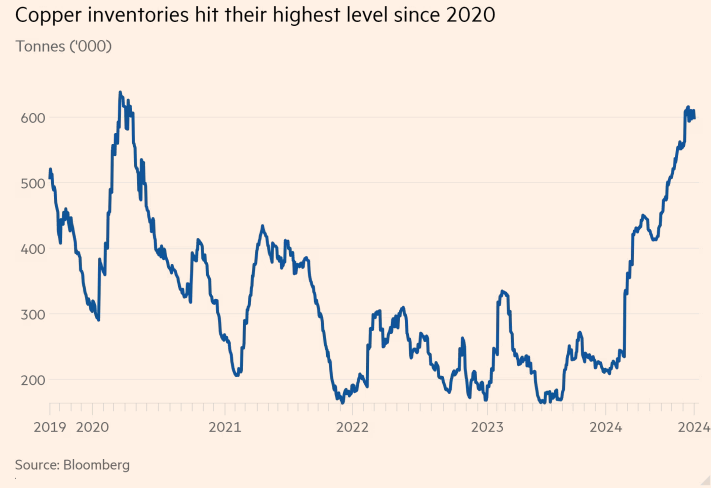 相关数据显示,全球铜库存已升至4年来最高水平,原因是需求疲弱导致大量铜进入仓库